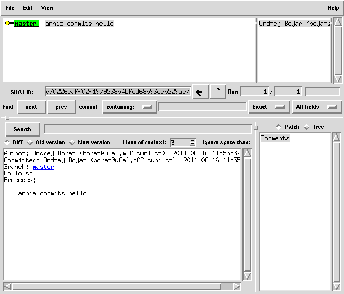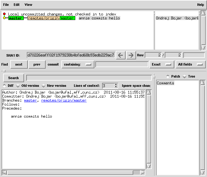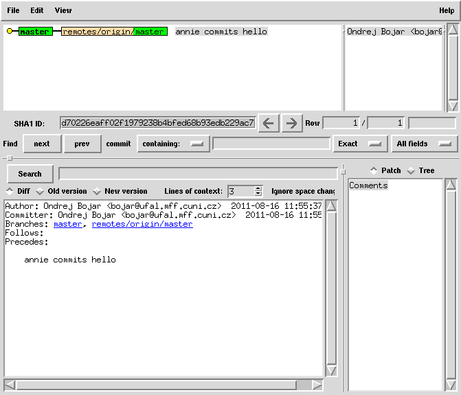echo 'hello' > README git add README git commit -m 'annie commits hello' # the commit is local only! it's not published yet! gitk --all