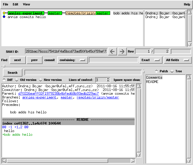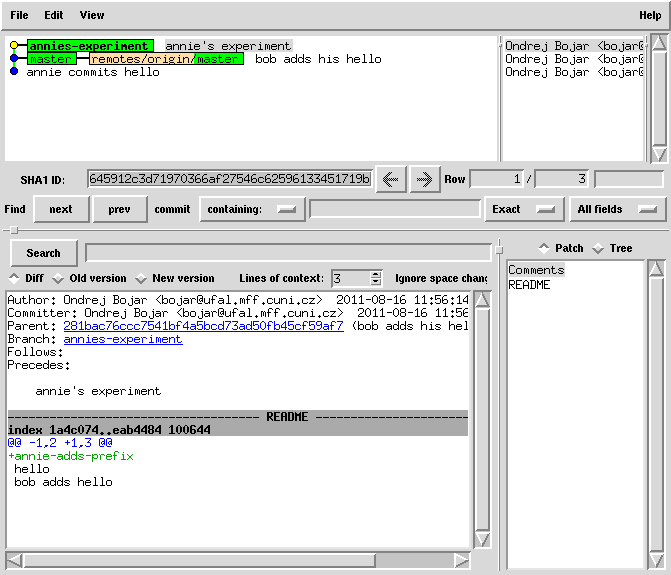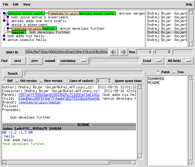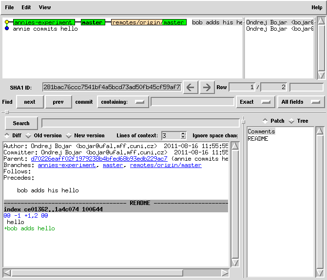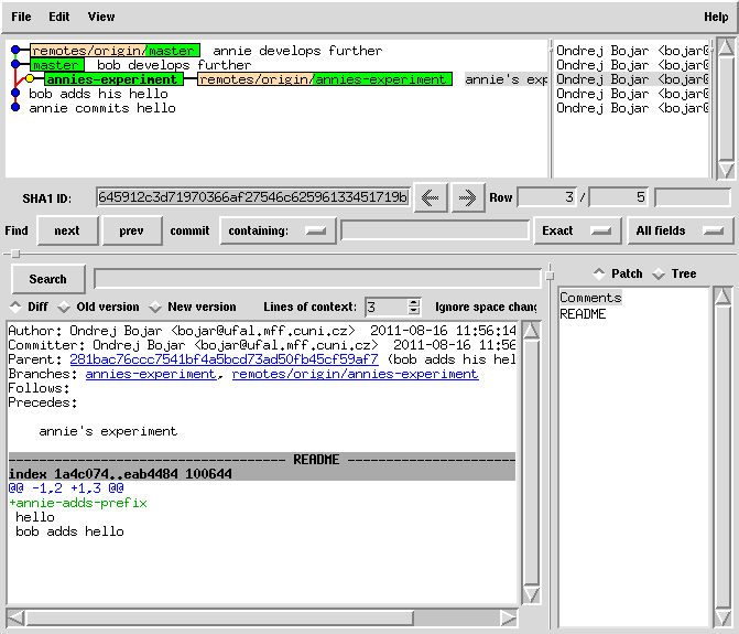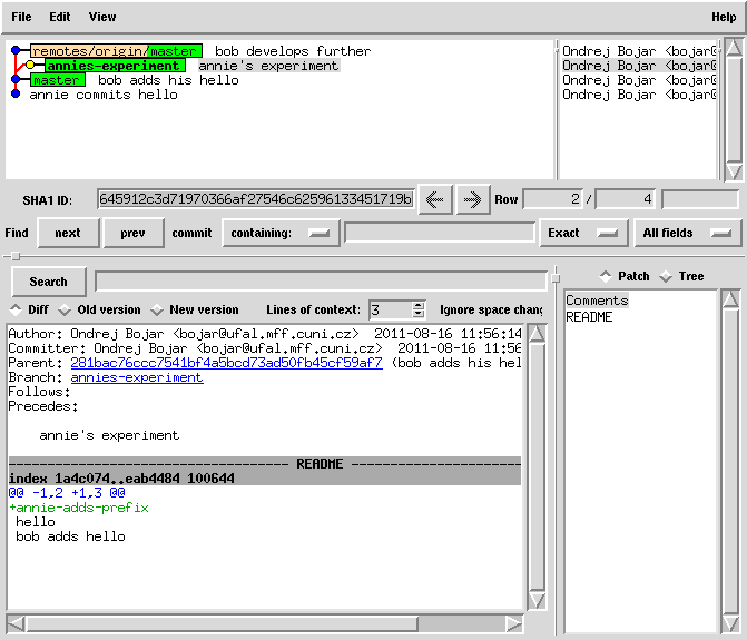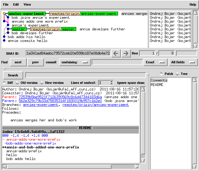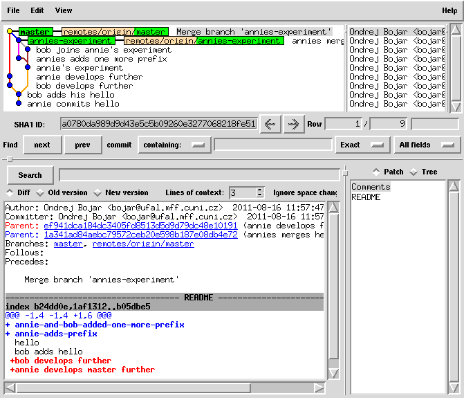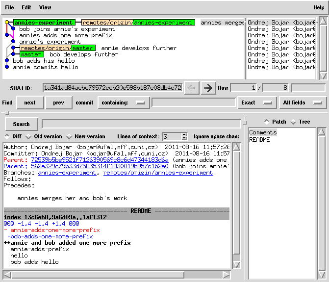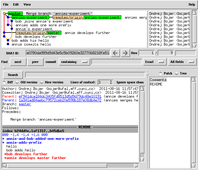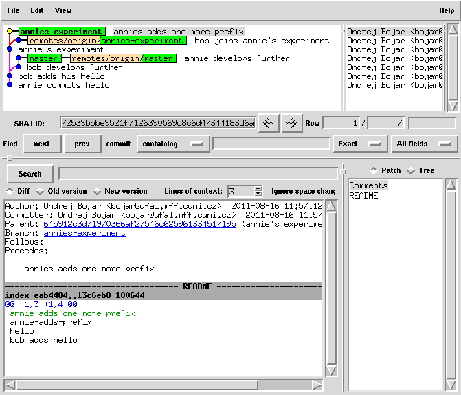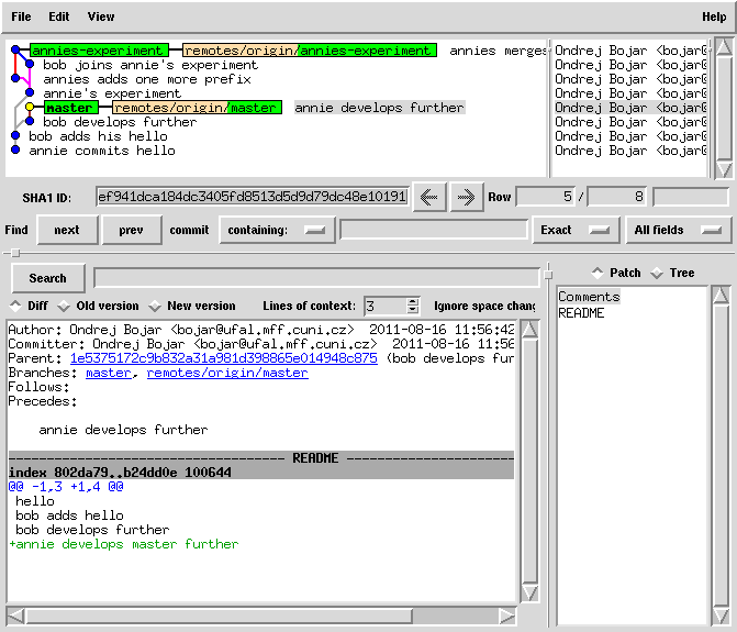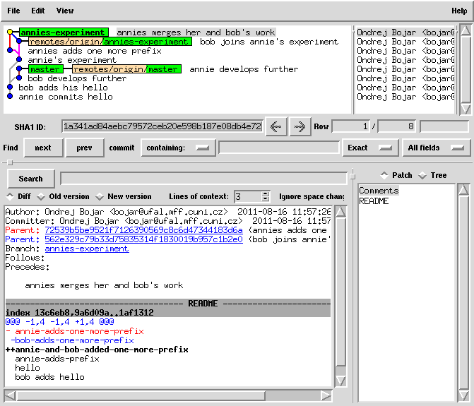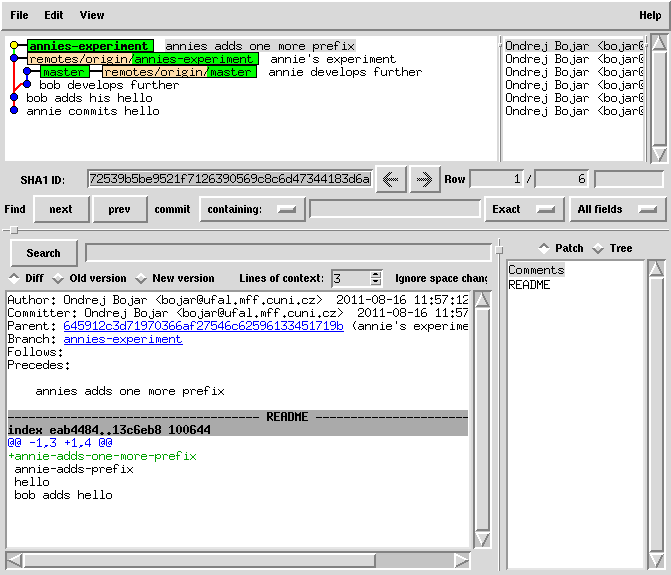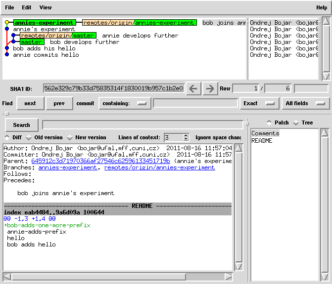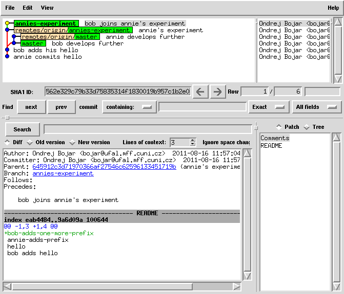 cat README | sed 1ibob-adds-one-more-prefix > README.new mv README.new README git commit -a -m "bob joins annie's experiment" # this commit was still only local!