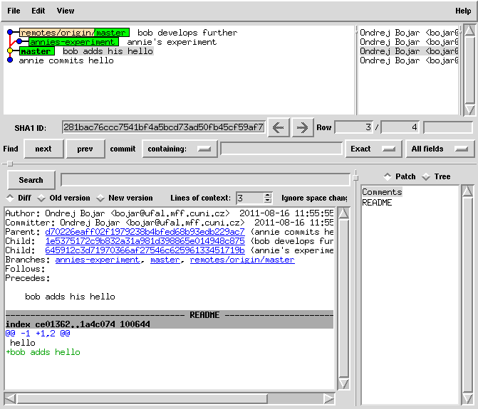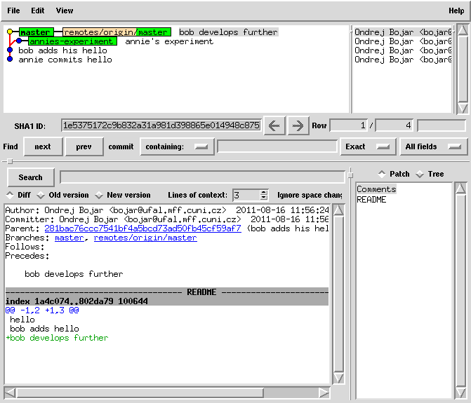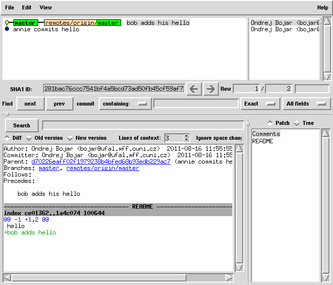 git commit README -m 'bob adds his hello' # note the fine-grained committing, specifying only the files we commit # you may also use 'git commit -a' to commit all modified files git push origin master