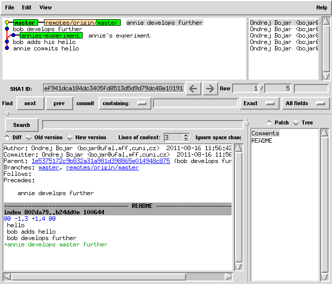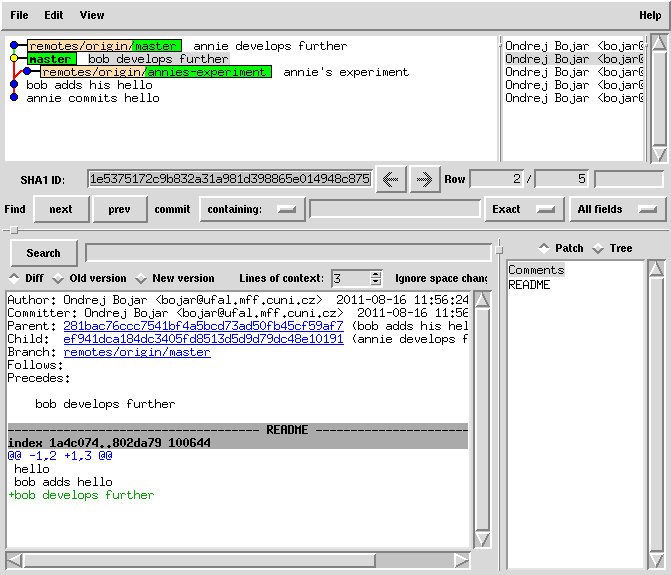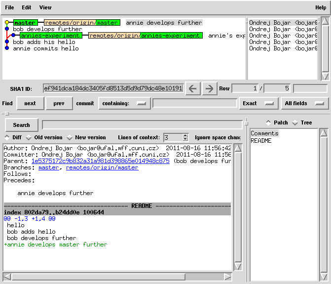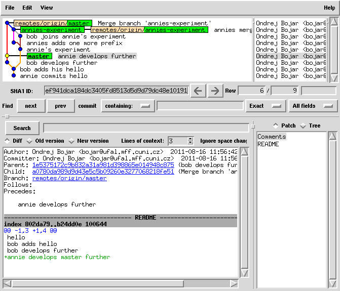 cd bob git fetch # bob came back from holiday and notices the master has evolved # and annie has published her branch